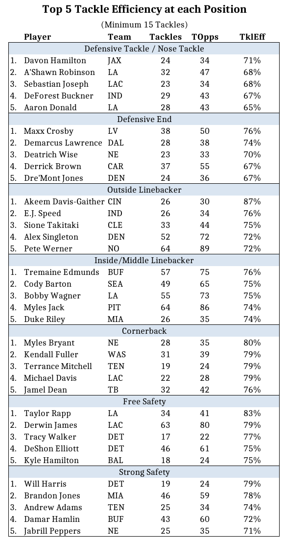 A players tackle efficiency = \(\frac{\text{Total Tackles}}{\text{Tackle Opportunities}}\)